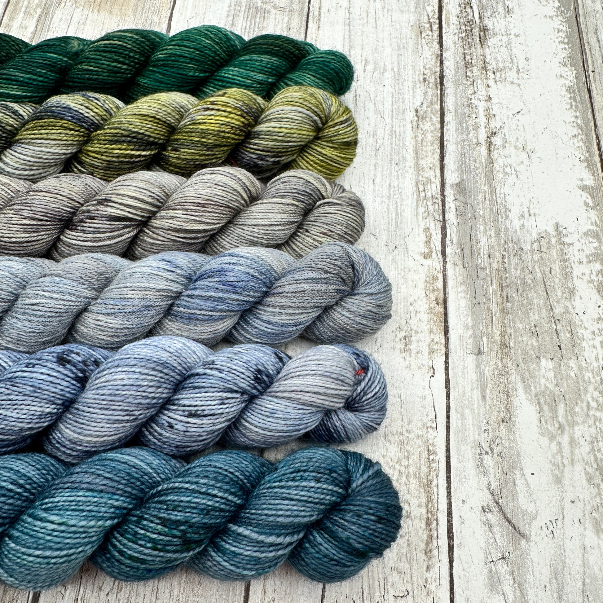 The fingering 50g sets are a mix of a 100% high twist base and a 75/25 base